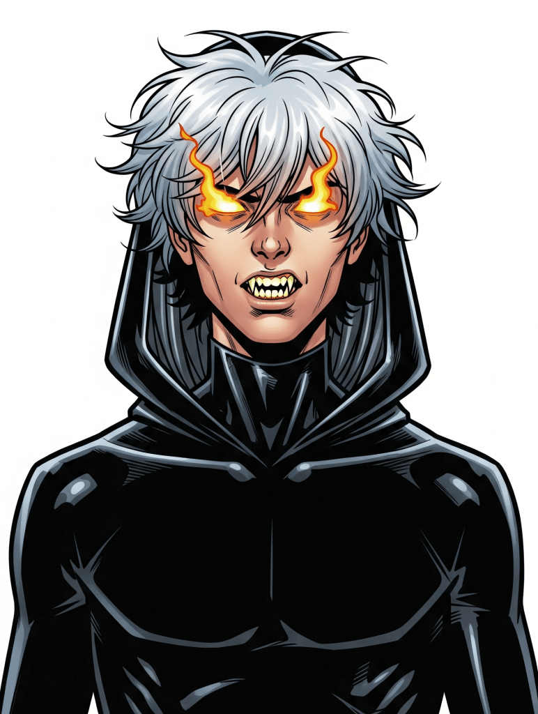 Inside the changing room, Chris, no he had to remember down here that he was Firewall, reached out with his mind, interfacing directly with suit circuitry and the anonymity collar and started to alter the primary settings. Minutes later, he had a skin-tight red and blue suit, topped with golden blonde hair and blue eyes, so different from his own bland brown eyes. He put the suit on and stepped out to see a slightly embarrassed Gustav; no, again he had to correct himself, he had to remember to call him Ashen whilst here, dressed in a plain white suit and unaltered face. “Would you like me to help?” To his surprise, all Ashen wanted was to alter the shape of his face and turn the costume black. He also changed his hair from white to silver and fiery eyes to disguise their colour. Seconds later, they both stood ready in the common room.