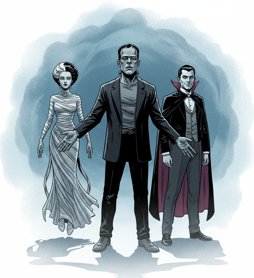 Something wasn’t right – as it got closer it was clear that lead figure was the perfect image of Frankenstein’s monster from the old films, perfect in every aspect or at least that was the initial impression – though wasn’t the monster supposed to be about seven feet tall or something? This imitation was about a foot shorter than that. The female floating behind him was also the prefect image of the old Bride of Frankenstein down to the white streak in her hair! He checked the cloaked figure, yip the spitting image of Bela Lugosi’s Count Dracula.