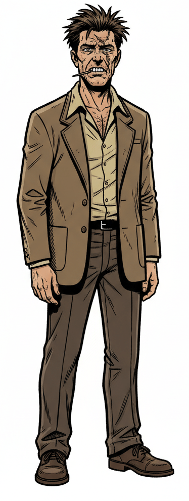 That man was the same height, weight and general build as himself, but there the similarity ended. The man in front of him was older and chewing obsessively on a toothpick; he was dressed in various shades of brown, hush puppy shoes contrasted with dark brown slacks and in a paler brown sports jacket over an open tan shirt with wing tip collar. His hair was unevenly cut and naturally spikey but it was the face that first caught your attention. A scar, ragged against his tanned face, ran across his left eye down to the corner of a mouth that seemed too wide for his face and made you aware of the lifetime of acne scars around his nose and mouth from too many years sniffing glue as a youth. It was a face even his own mother would struggle to love.