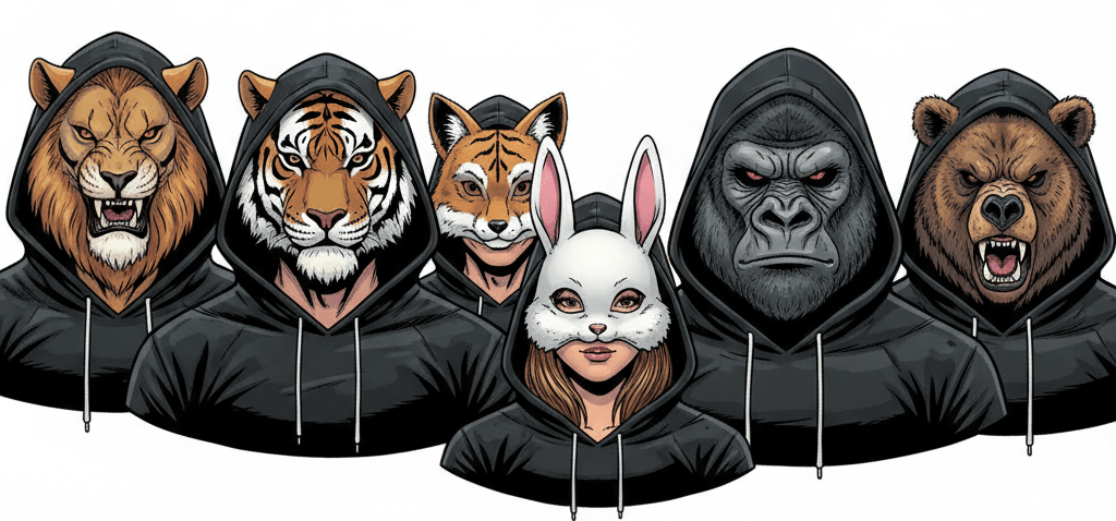 Then they saw them – a group of young people in pulled-up hoodies, their faces hidden behind a series of animal masks advancing on her from the direction of the toilets, hooting and making animalistic screeches. The masks were all of predatory animals except for one of the younger female figures who incongruously had chosen a cute bunny mask.