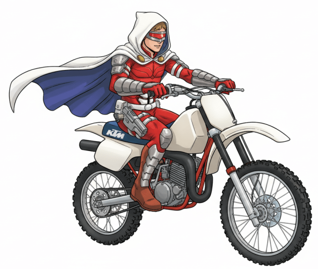 Seconds later, he reached the wall as he somersaulted in mid-air through the gap as the wings retracted. He hit the pavement at about 20 miles an hour, his gymnastic roll absorbing some crash damage and his still rigid cloak acting as a shield absorbing most of the rest (though not all) of the impact. He picked up his bruised and battered body off the ground and limped back towards his parked bike.