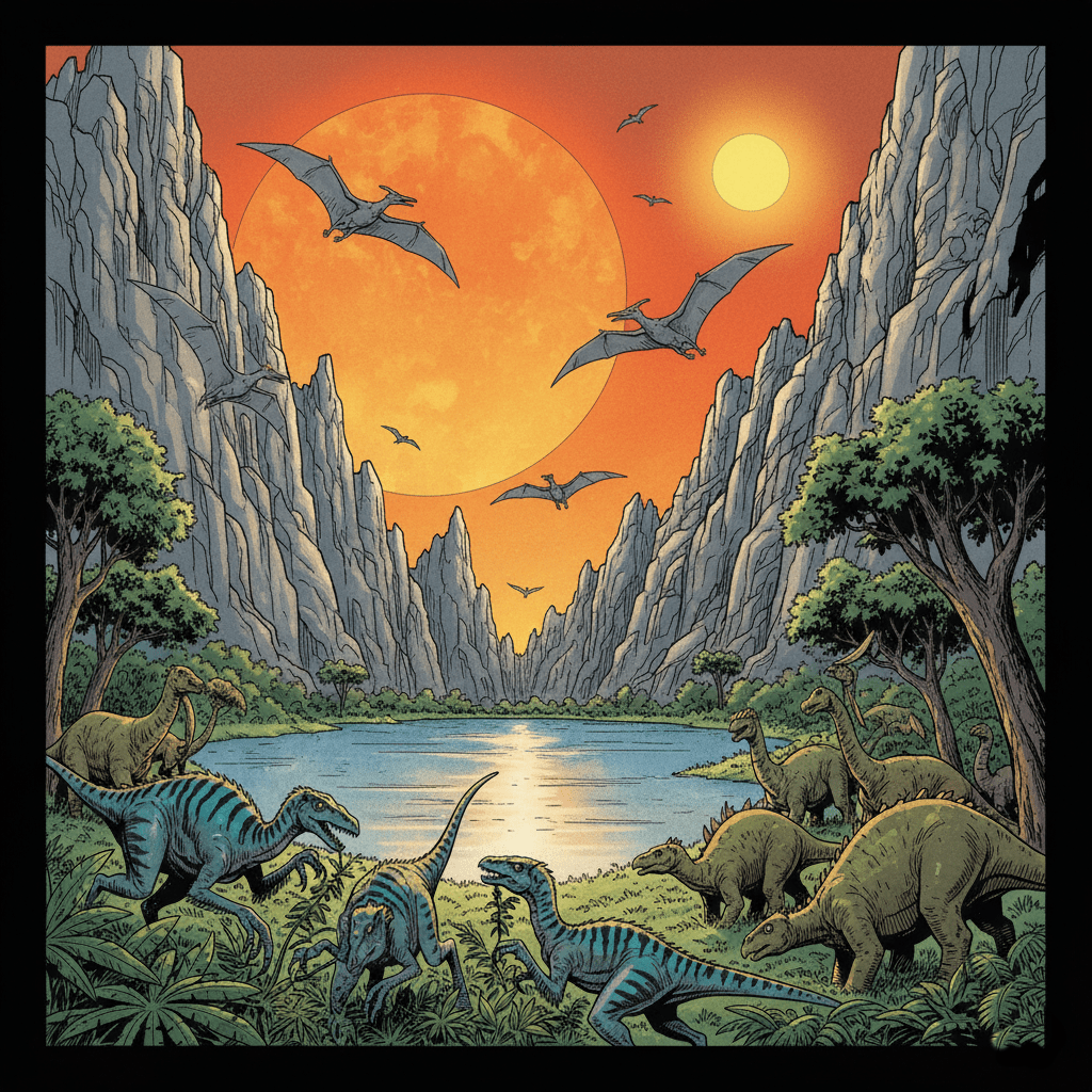 Within seconds, the sudden pressure differences caused vapour clouds to form on the outside of the craft. This fog thickened until the passengers could see almost nothing outside. Ionisation however could be felt, and most of them began to see dancing lights on their retinas, even as Lillie and Bubbles both reported that they appeared to be suffering from tunnel vision. As the deafening whine of the craft’s engines faded, they could hear new sounds, of wind, rainfall and the distant cry of some animal. Then the mist rapidly cleared and it was obvious that the scenery outside had changed – they are now hovering over a jungle environment near a lake surrounded by high cliffs above which hung two Suns, one large and orange and the other smaller, yellow, almost sol-like. Below were what could only be dinosaurs; Colin immediately recognised herds of both deinonychus and iguanodons grazing by the water’s edge. Grey-skinned pteranodons could be seen swooping around the cliff face outside their portholes, and they could feel the heat of the burning suns on uncovered skin as it shone through the windows.