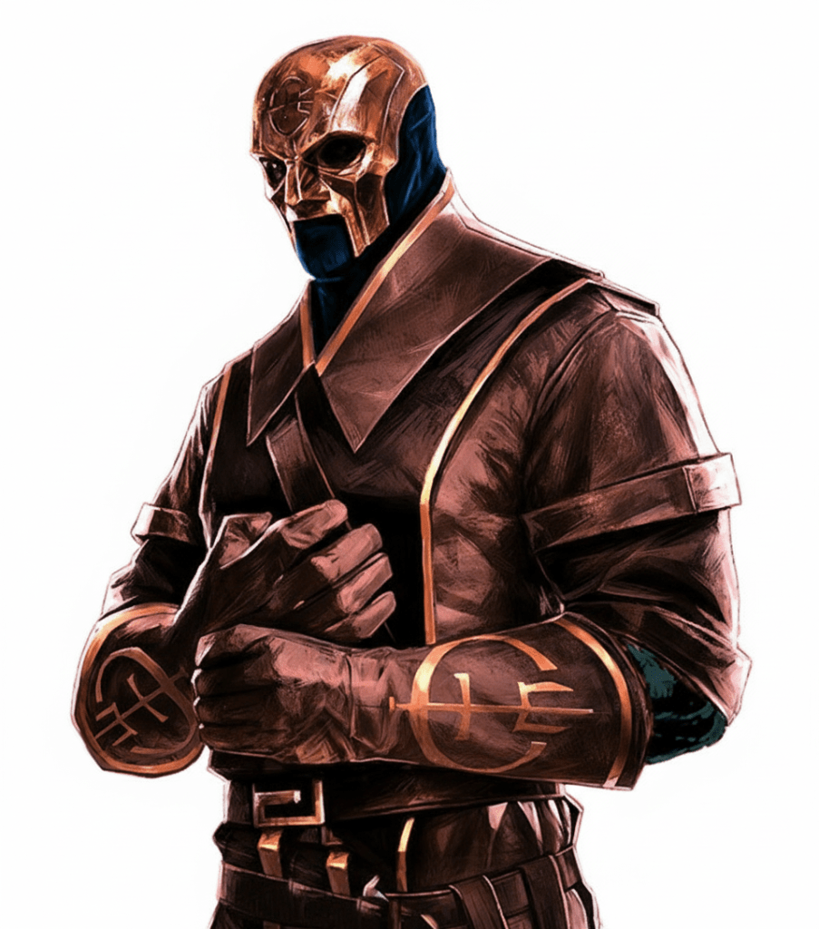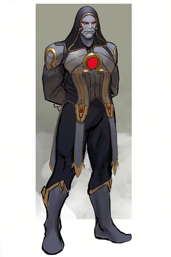 Then over on the other side of the rim, a massive three-metre tall humanoid stepped through a circle of light that had appeared suddenly and unexpectedly. Reinforcements? The figure stood alone, his face like stone, his body perfectly formed as though sculpted, his head covered by a metallic hood and his body protected within grey armour surrounding a large, pulsing red disk on his chest. He stood in front of her, hands behind his back, his eyes glowing red. His sudden appearance however caused an instant response in Morrigu’s countenance, as she suddenly looked both trapped and terrified.