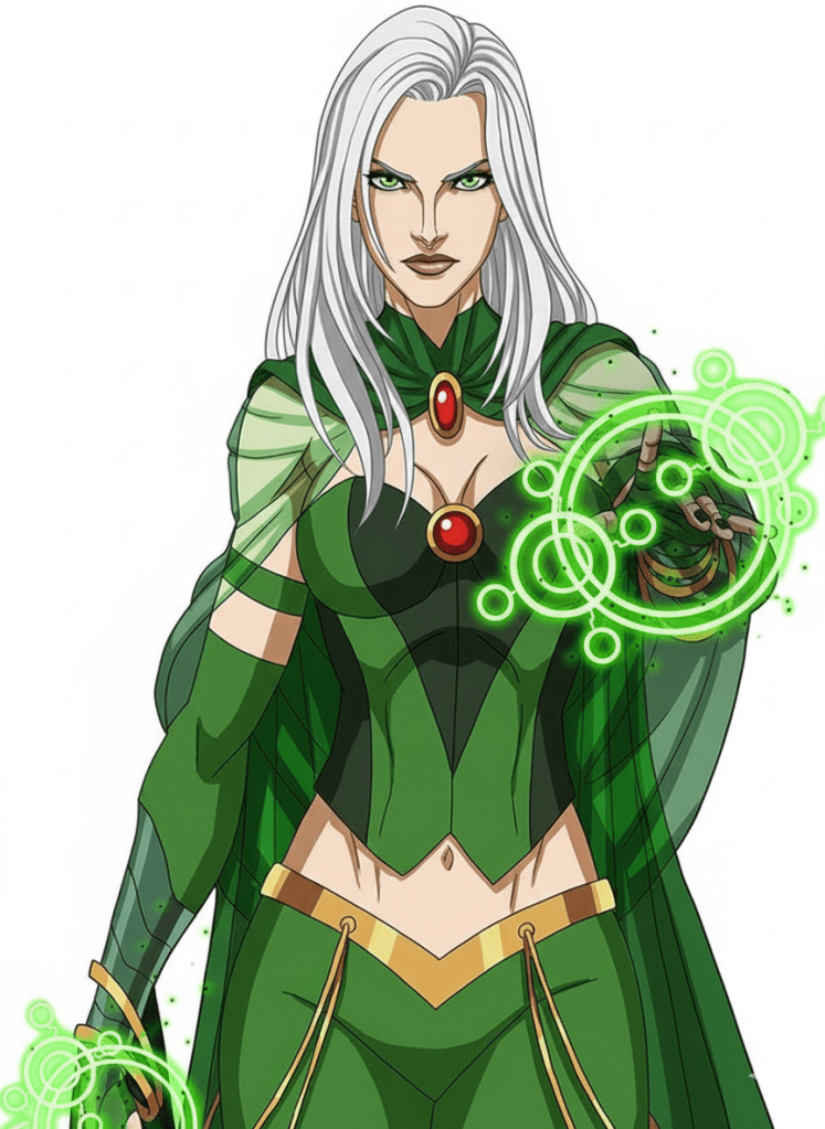 They couldn’t help notice that the machinery on the platform now looked different somehow; more sinister; Morrigu wasn’t bothering to disguise her machinations. The pale woman no longer wore soft robes, but gleaming emerald-coloured armour instead with a large sword belted to her waist and her eyes glowed green. “Very different look but still sexy!” muttered Firewall under his breath.