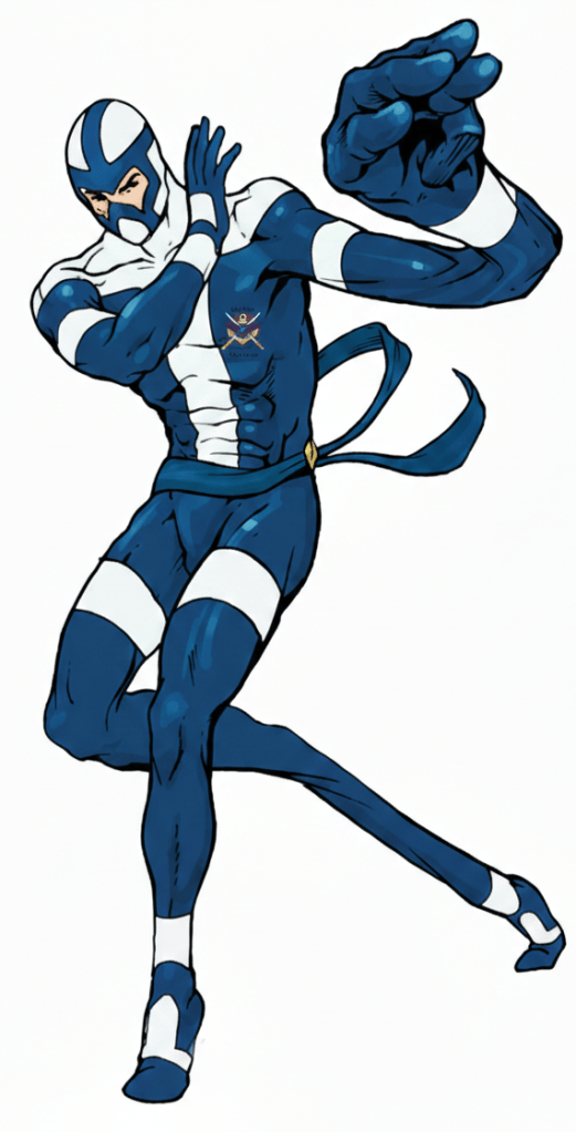 Not wanting to risk waiting, Cadet swung up and into the roof area using his grapnel as he threw another flash pellet as well as a tear gas one at Lethal’s feet. To his amazement, the boy anticipated the move and stepped well back, somersaulted over the fumes using his staff and then used the wall to bounce into the air and carry out a double strike to Cadet’s temple and nose before executing a perfect landing in front of him, still with his bloody eyes closed! Blood from Cadet’s nose spurted down the front of his costume but he closed off his bleeding nostrils using the nose-grip on his visor and ignored it.
