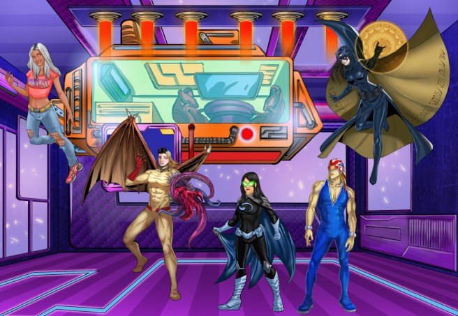 They found a quiet corner and worked out what to do next. He’d half expected Firewall and Kid Arachnid to bow out as they might not want to reveal to the others their civilian identities, but they had all arrived together in their usual after school attire. Kid explained that as Bubbles and Kitty were already outed and he knew Colin’s identity from the Diva Gaea affair that it seemed pointless to hide his own identity.